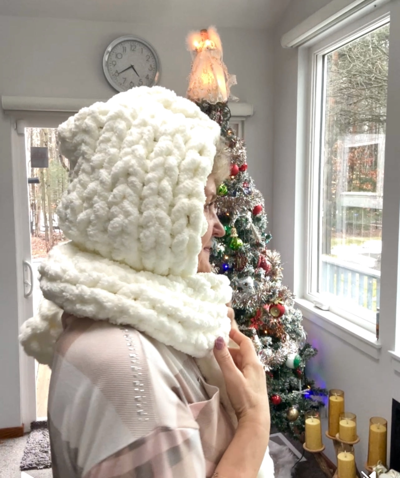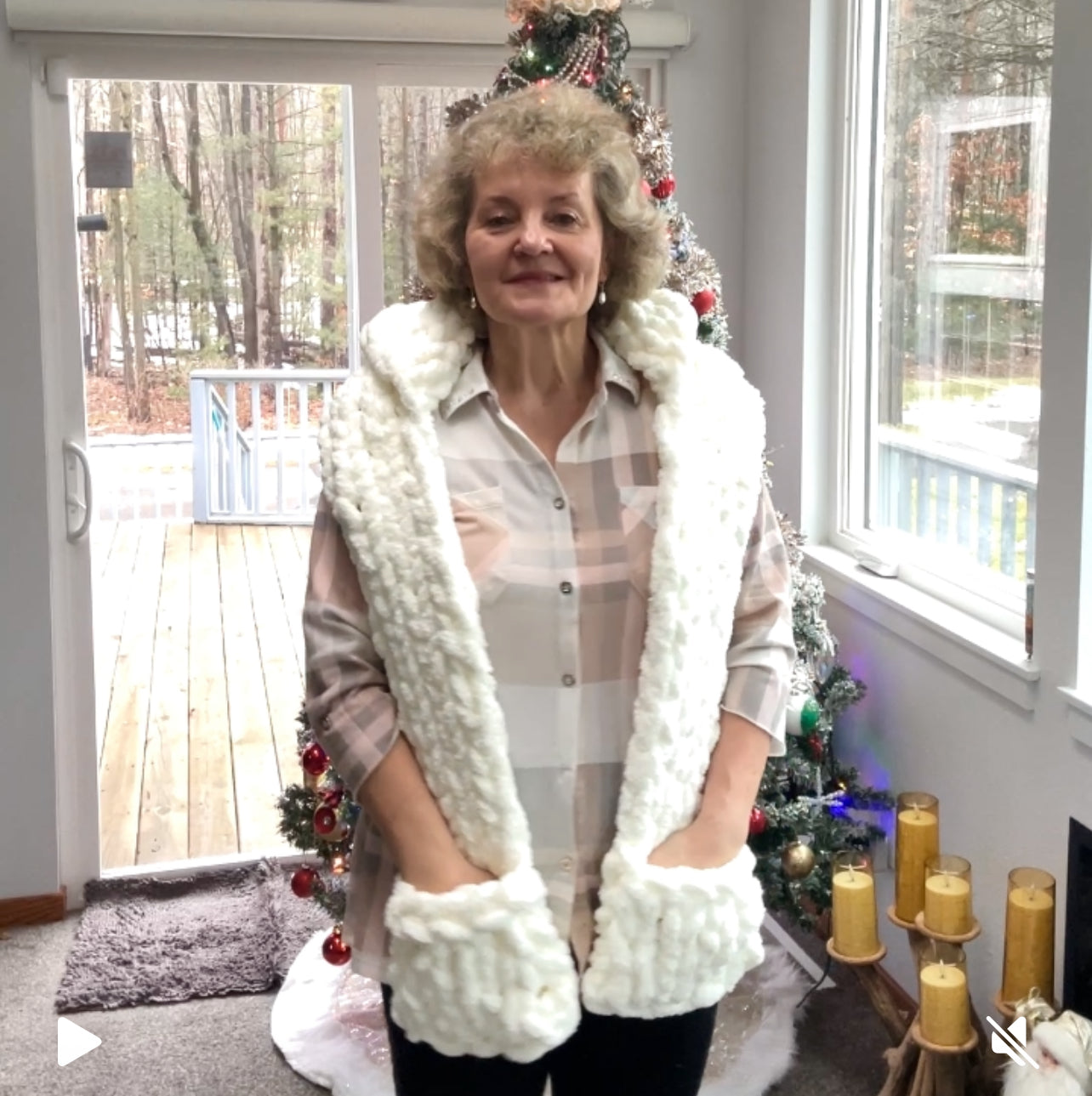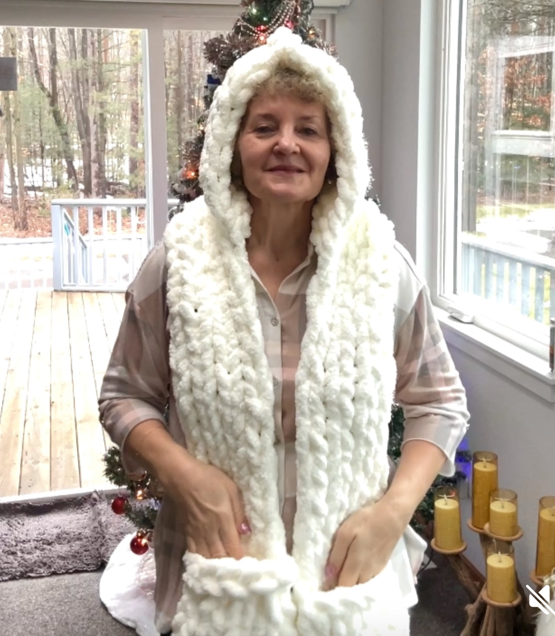 This DIY Kit includes BeCozi Chunky chenille yarn and a Video tutorial for a scarf with a Hood and pocketsĀ