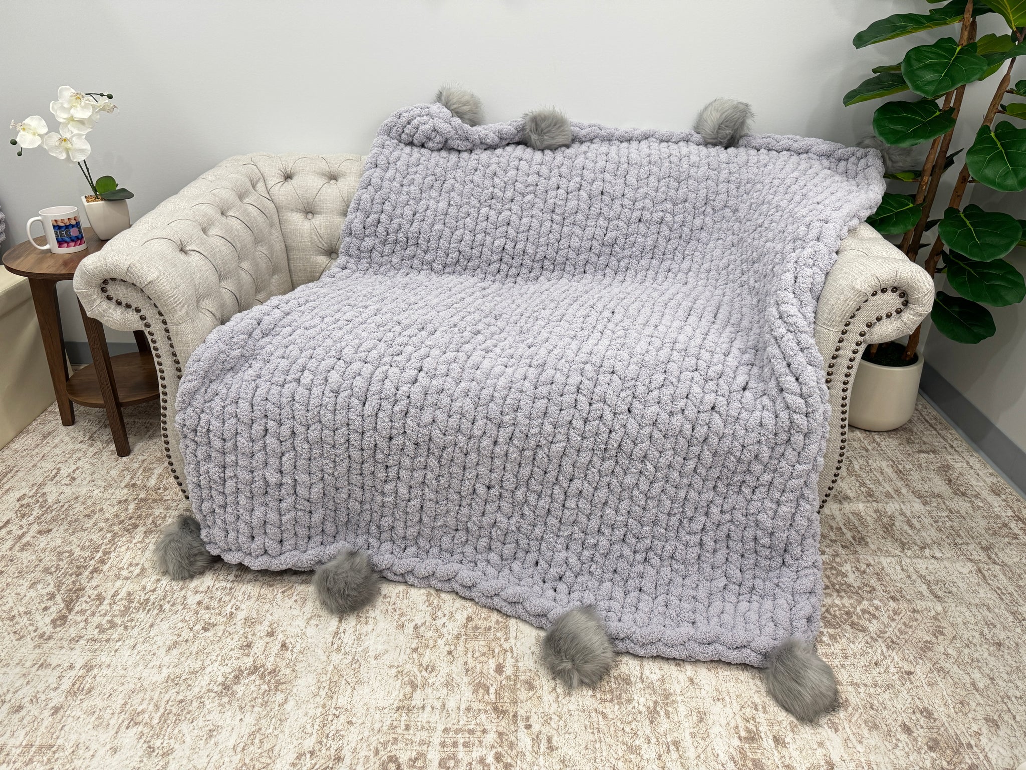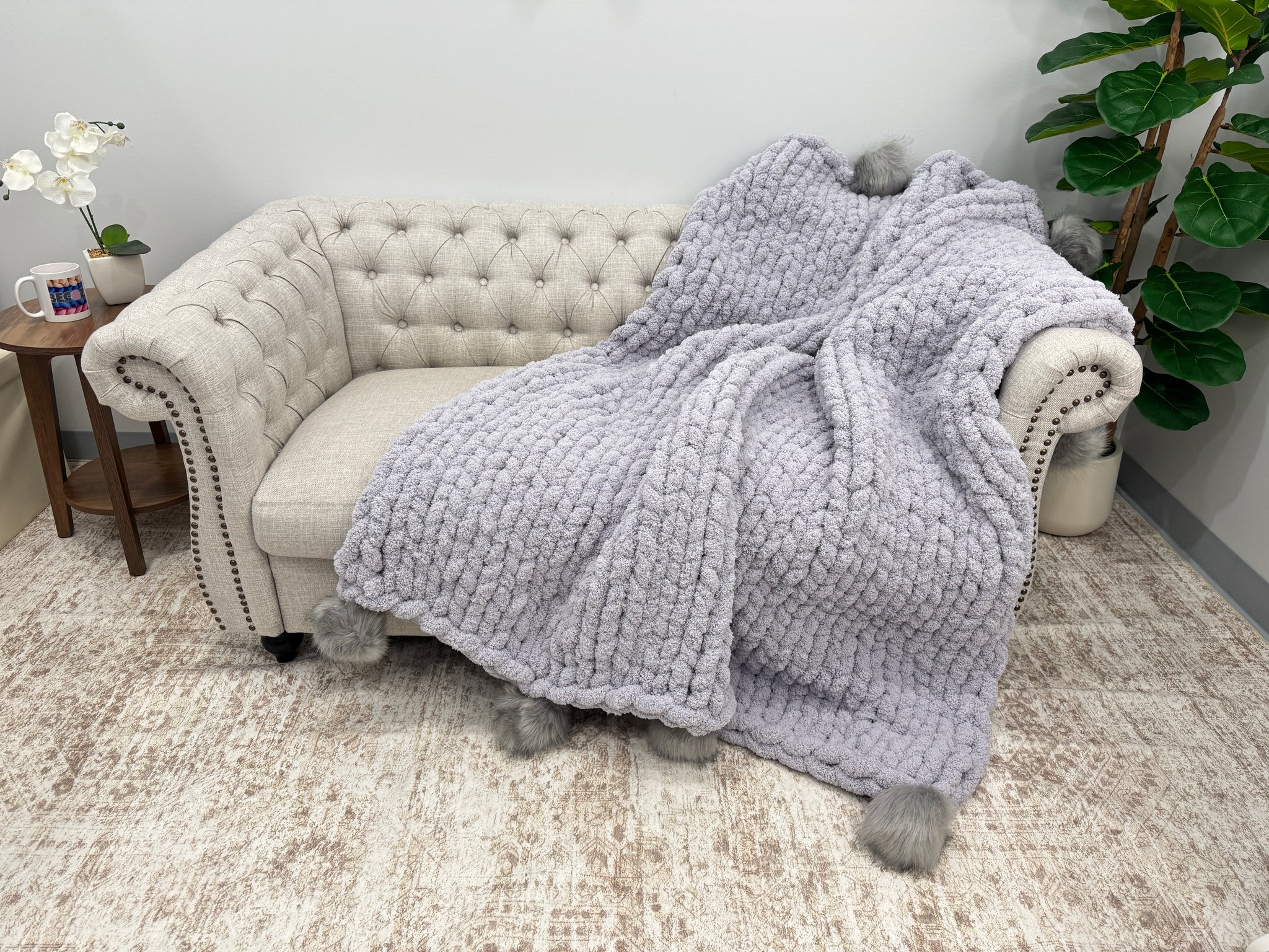 Pom poms: artificial fur, matching color (might not be the same color as the yarn/blanket)