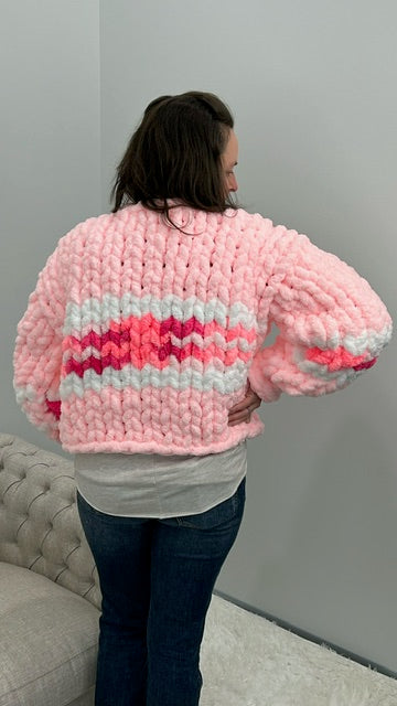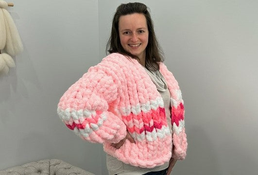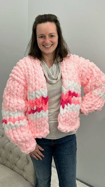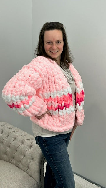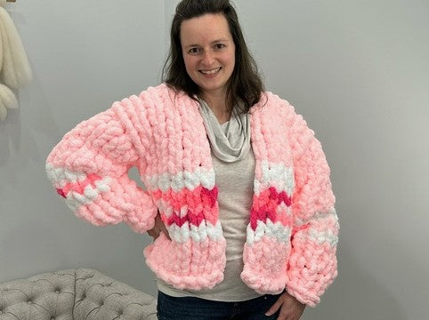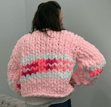 This cute Cardigan is Hand knitted with our super chunky chenille yarn