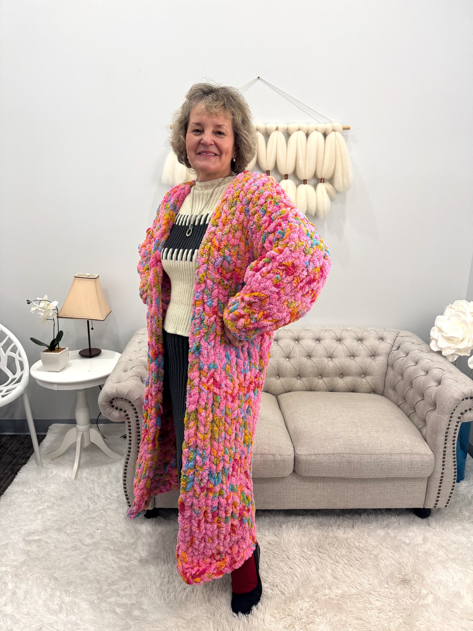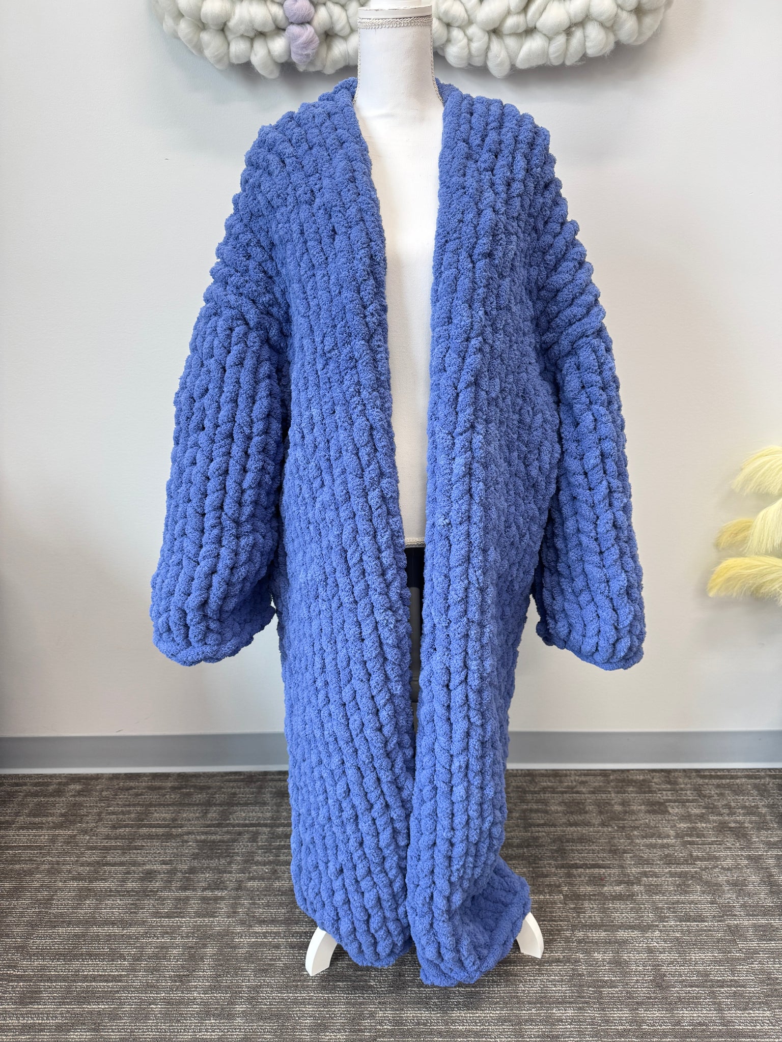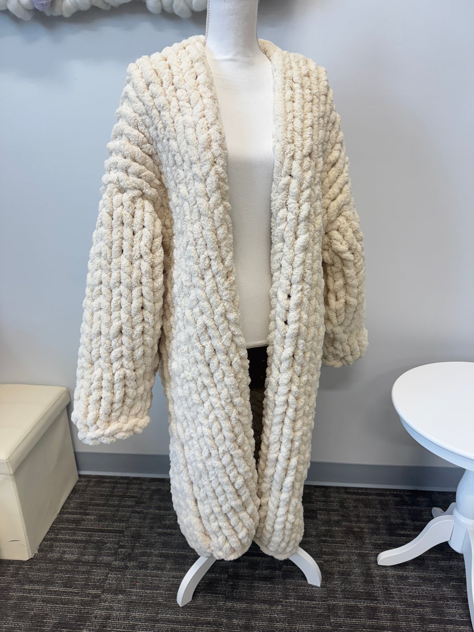 This Cardigan is Hand knitted with our Chunky chenille yarn