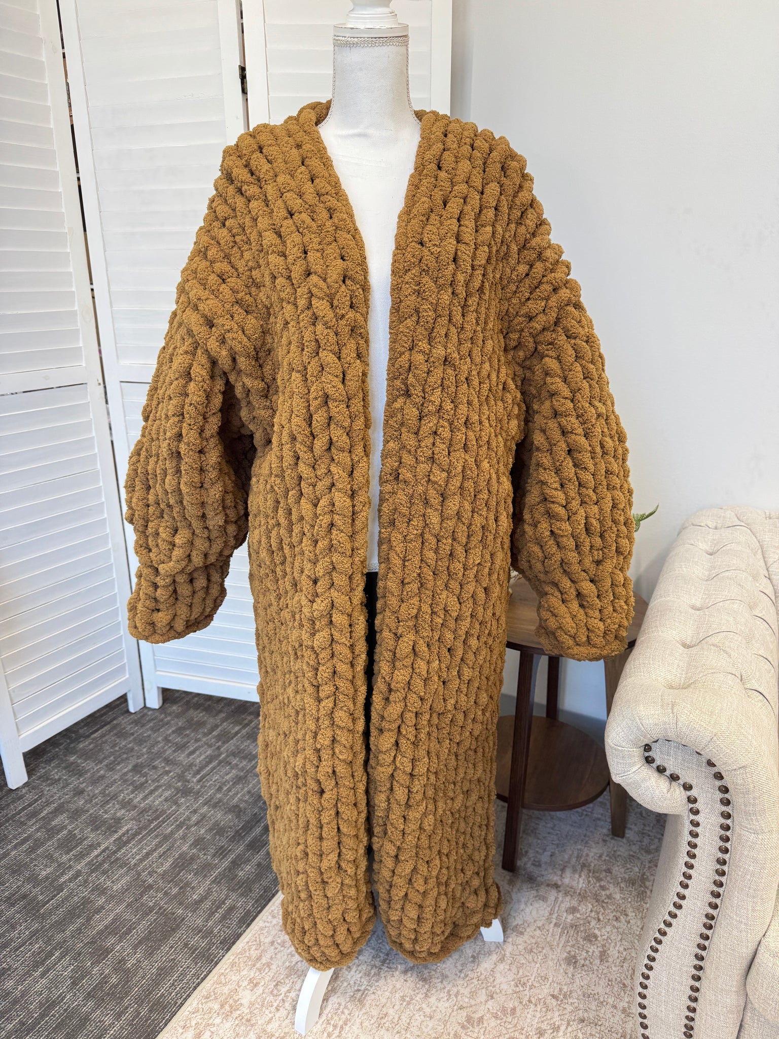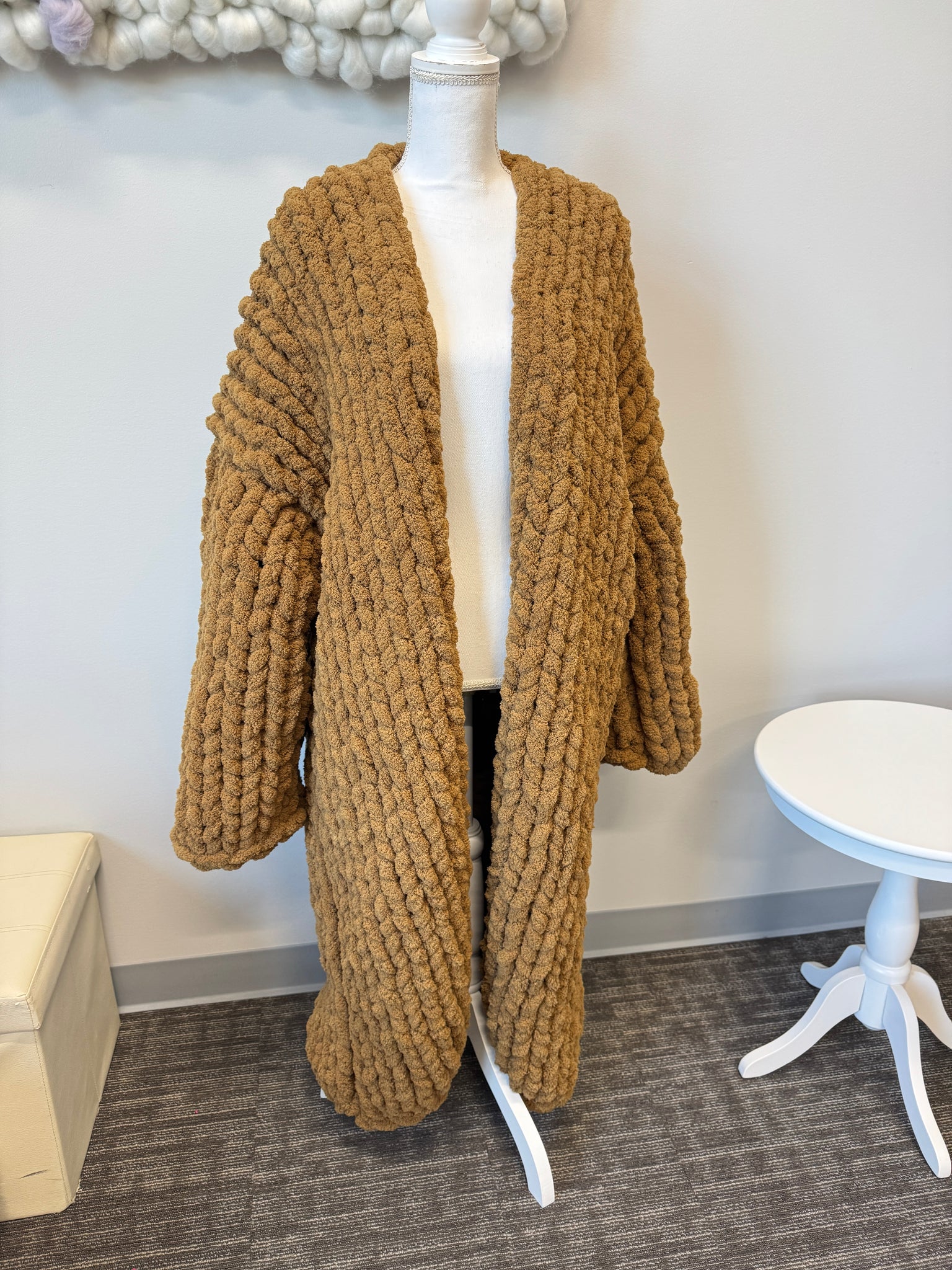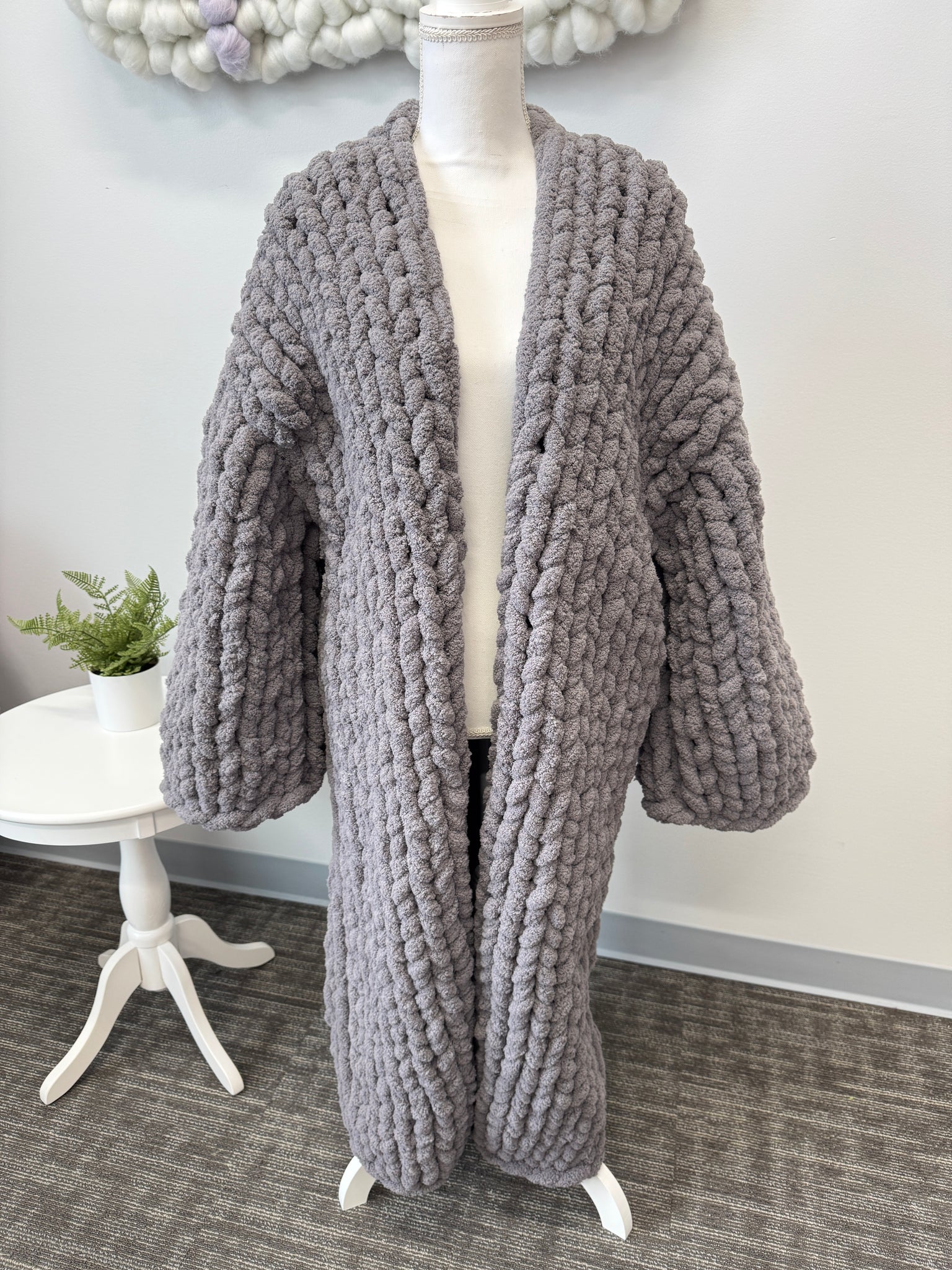 This Cardigan is Hand knitted with our Chunky chenille yarn