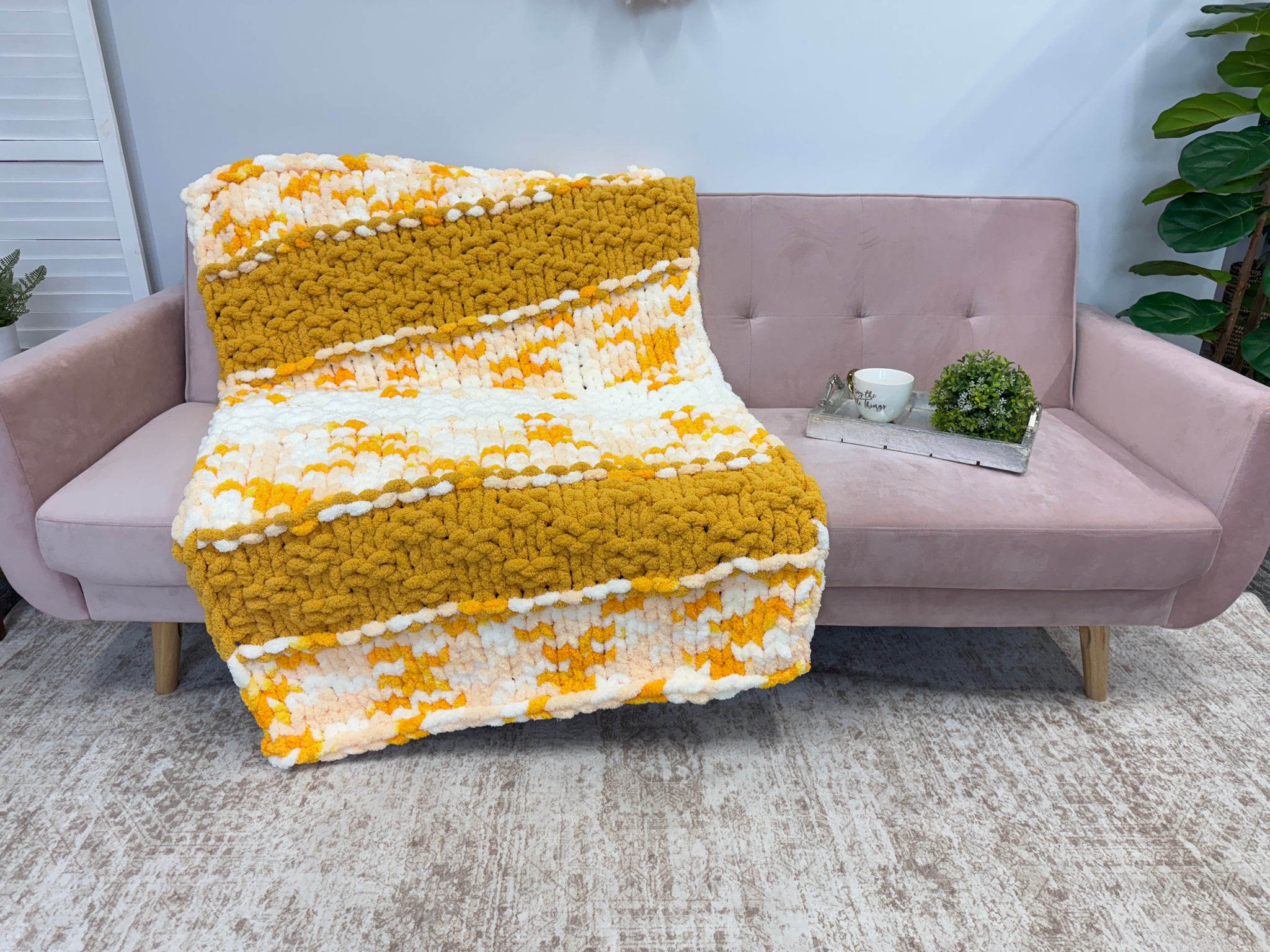 A fun yellow blanket to brighten your space! Made with soft BeCozi Chunky Chenille Yarn