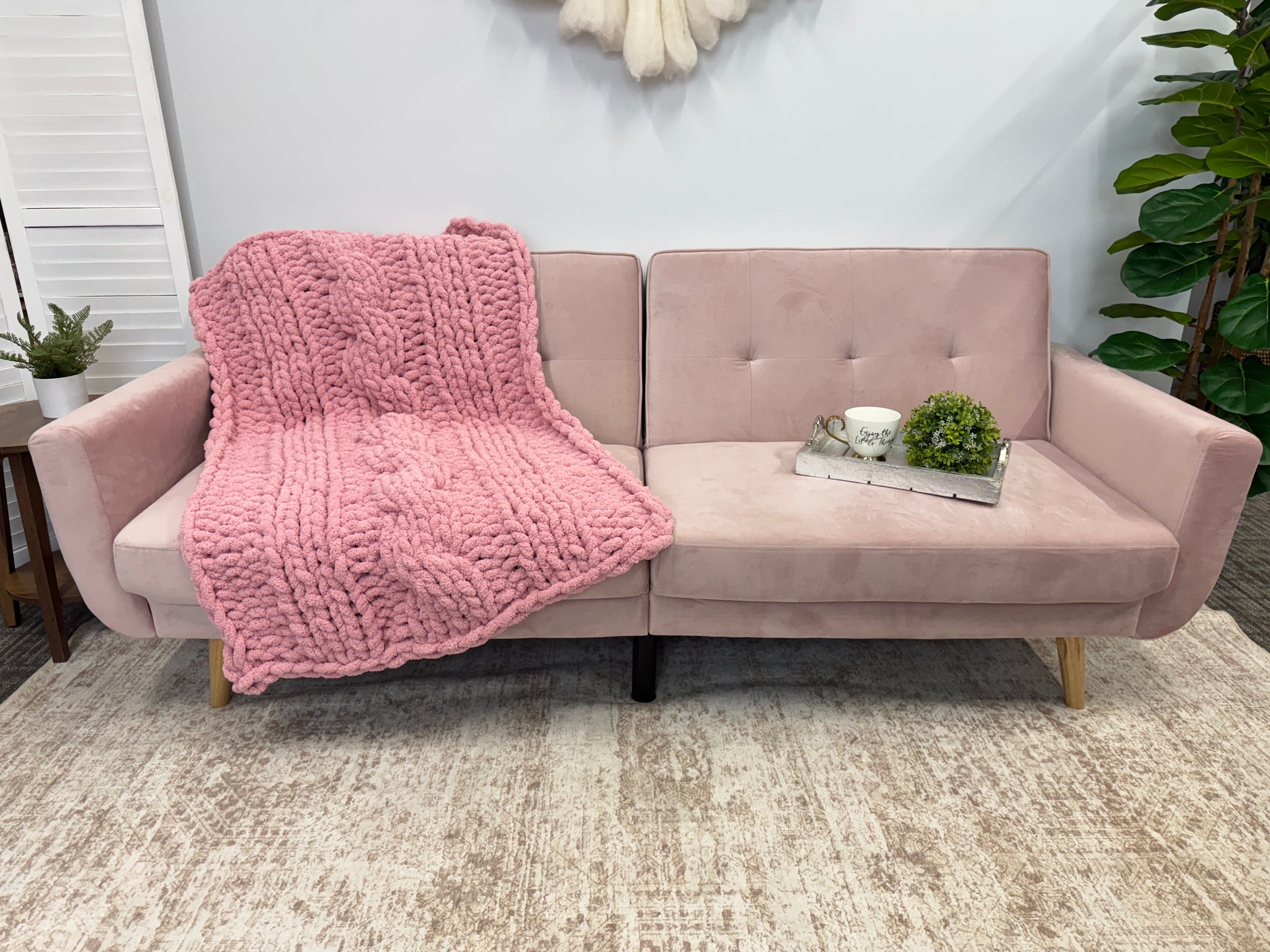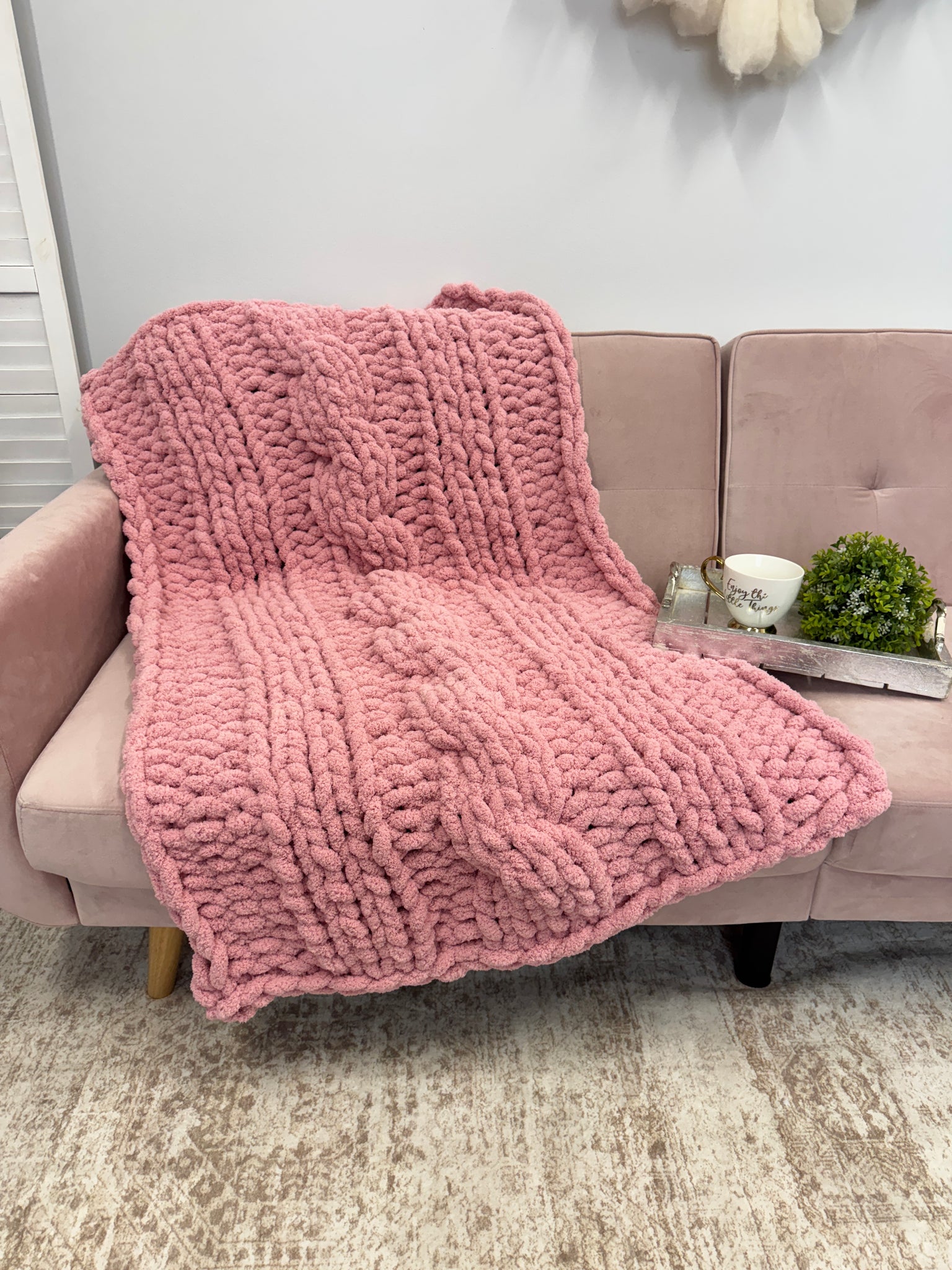 A beautiful pink blanket to brighten your space! Made with soft BeCozi Chunky Chenille Yarn