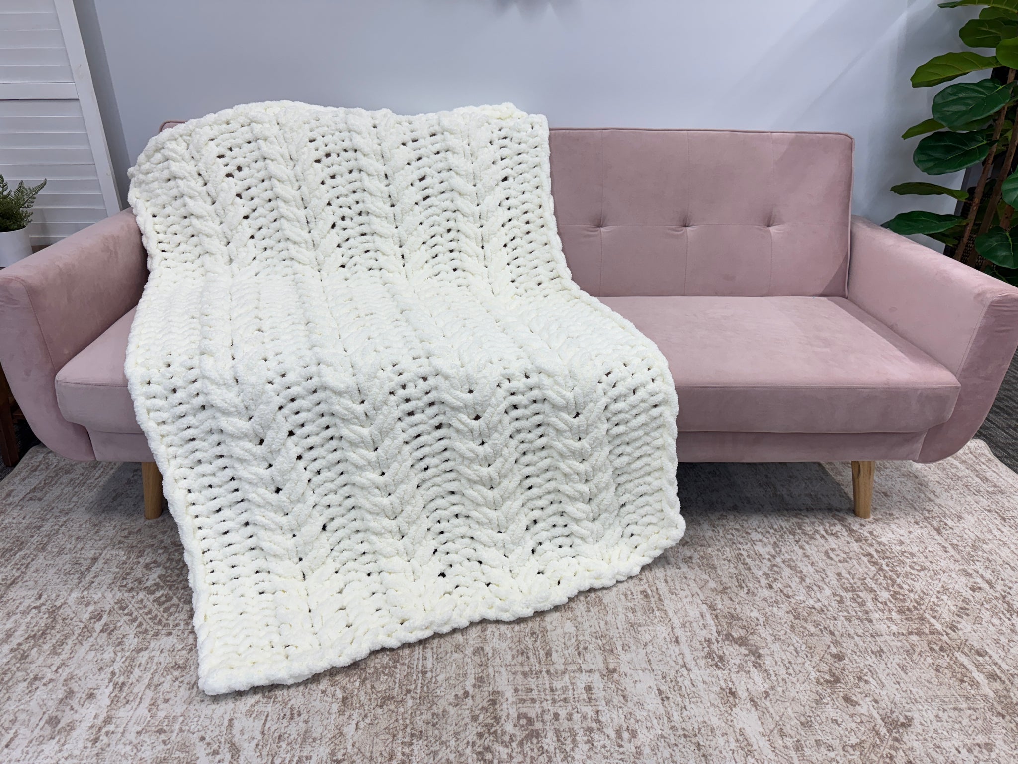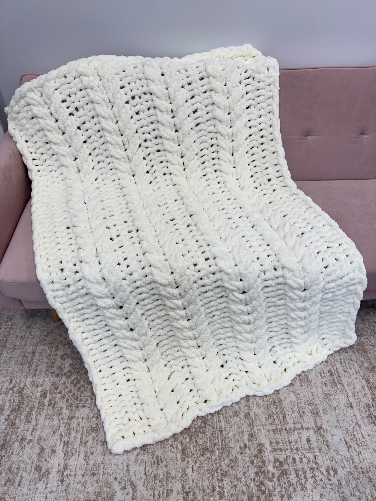 Chunky chenille yarn in Ivory, Flower Cable pattern