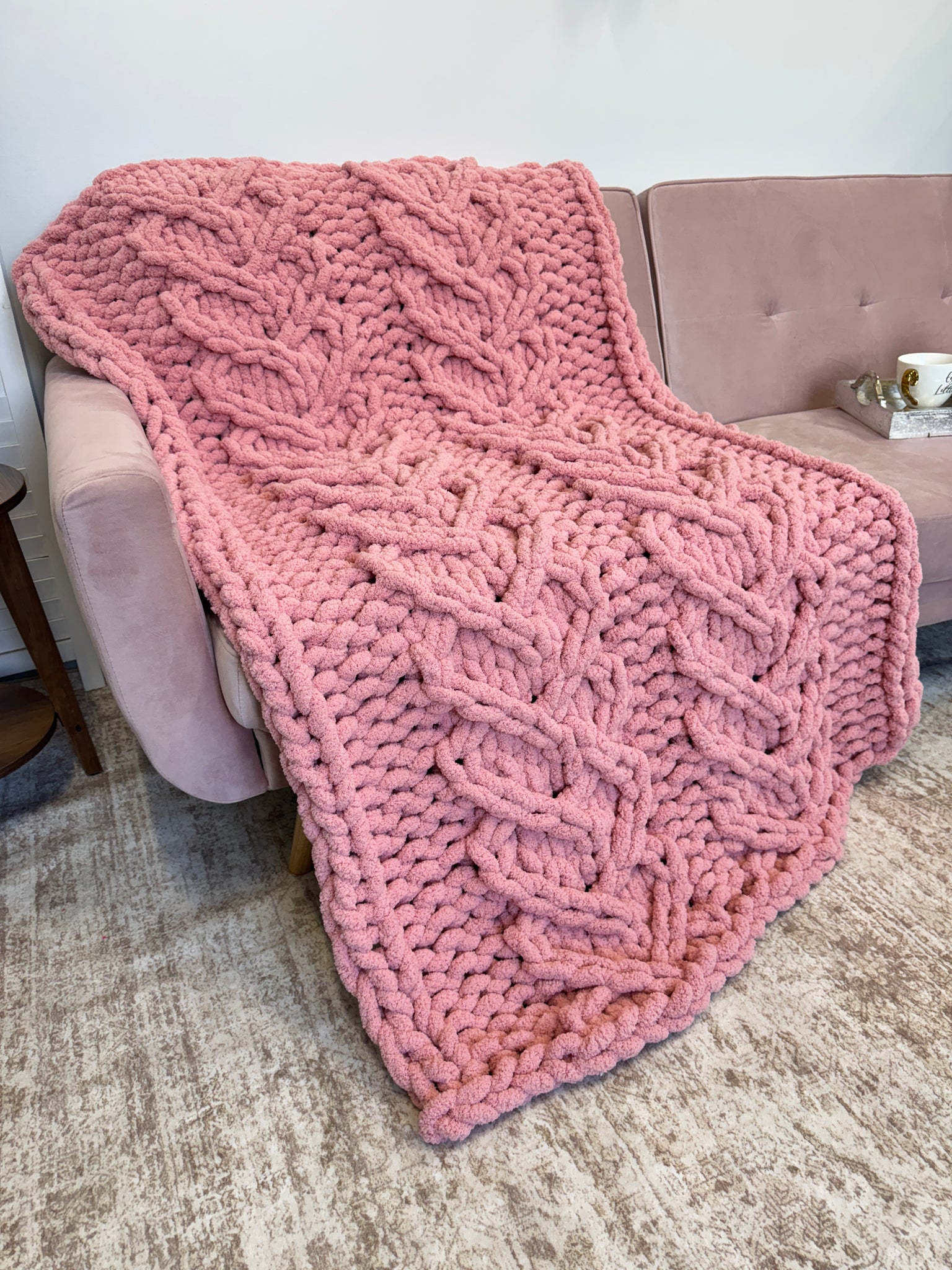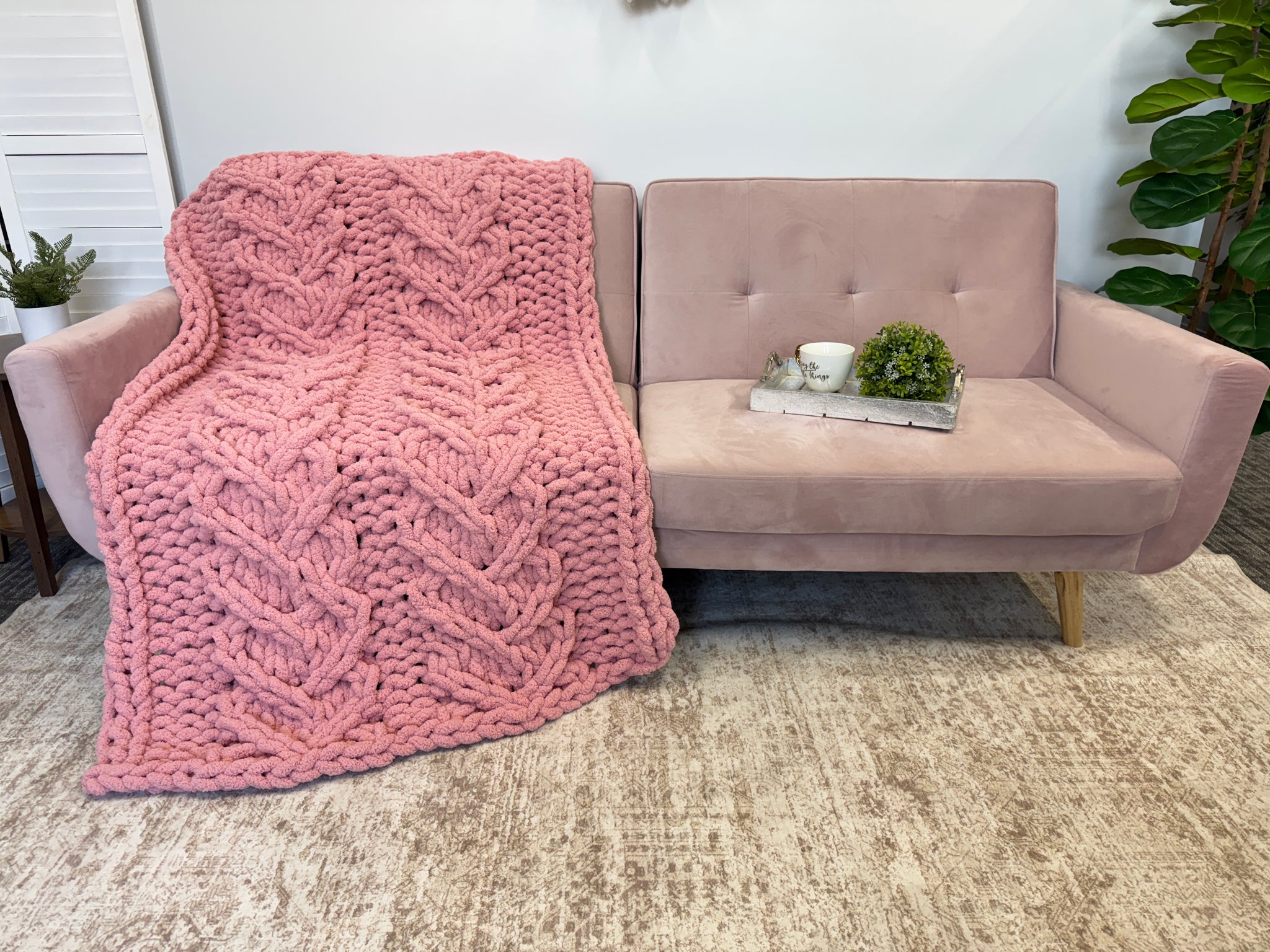A beautiful blush heart blanket to add to your space! Made with soft BeCozi Chunky Chenille Yarn