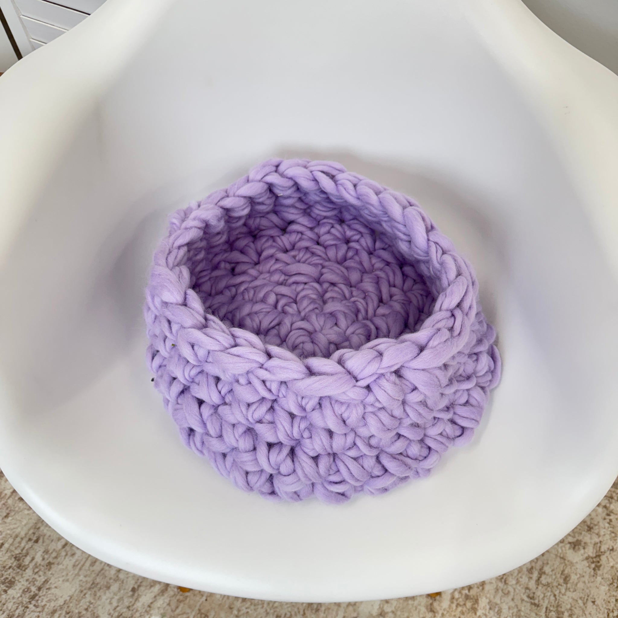 The cutest cat bed made with BeCozi Thin Merino, Lavender color