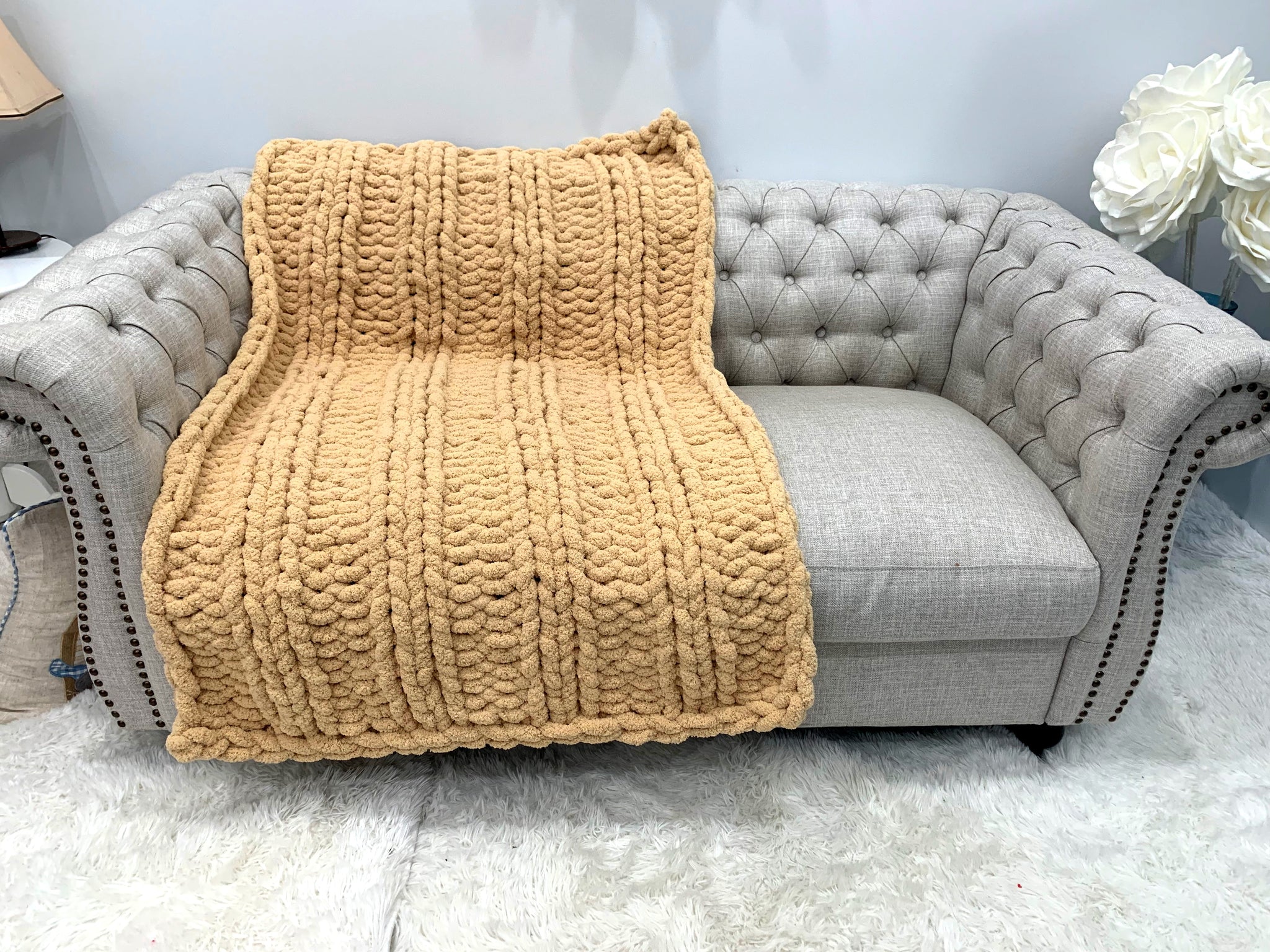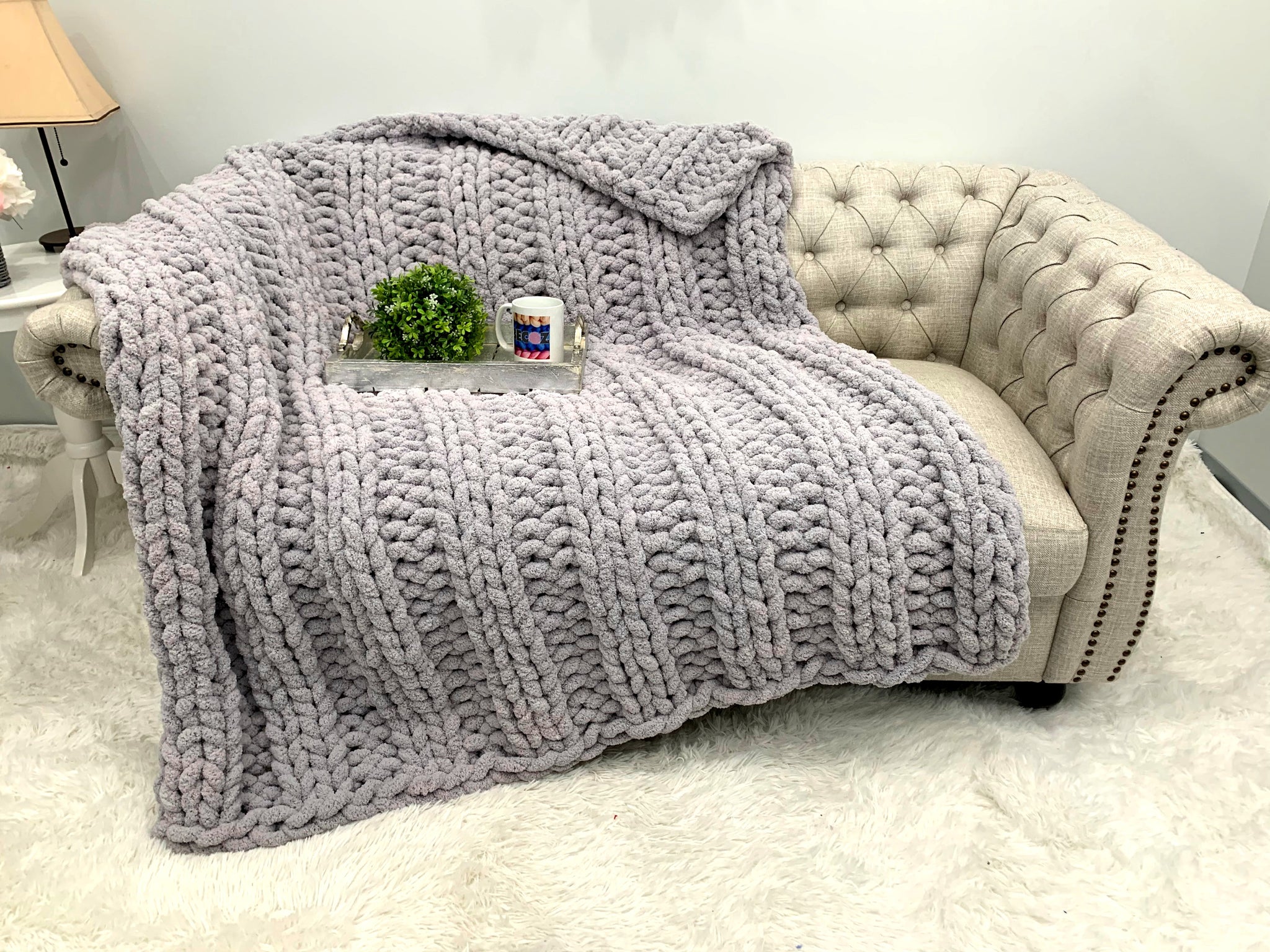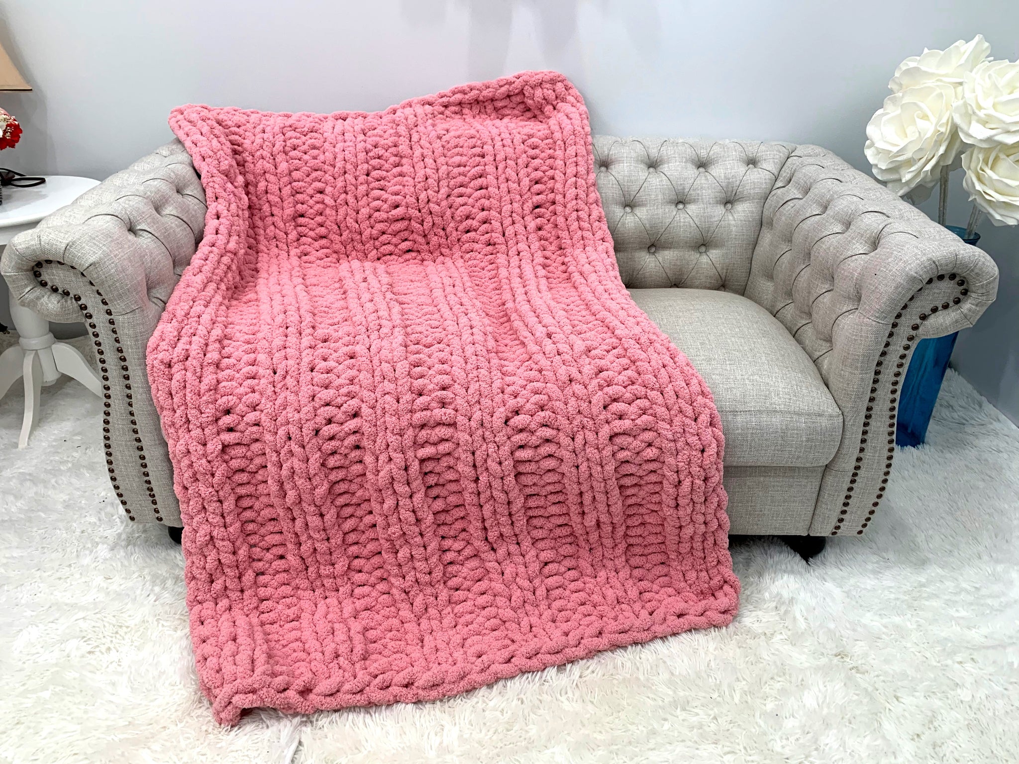This gorgeous blanket made from BeCozi Chunky chenille yarn, 100% polyester, 2/3 inch thick